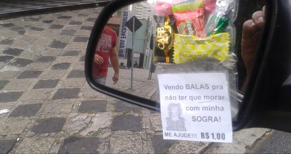 Mas na categoria vendas, o melhor case que presenciei é o de um sujeito que, no último fim de semana, colocava dois saquinhos de bala presos por um grampo pendurados no retrovisor dos carros. Neles, uma mensagem típica do melhor marketing de causa...própria: “Vendo balas porque não quero morar com minha sogra. Me ajude!” (foto acima).